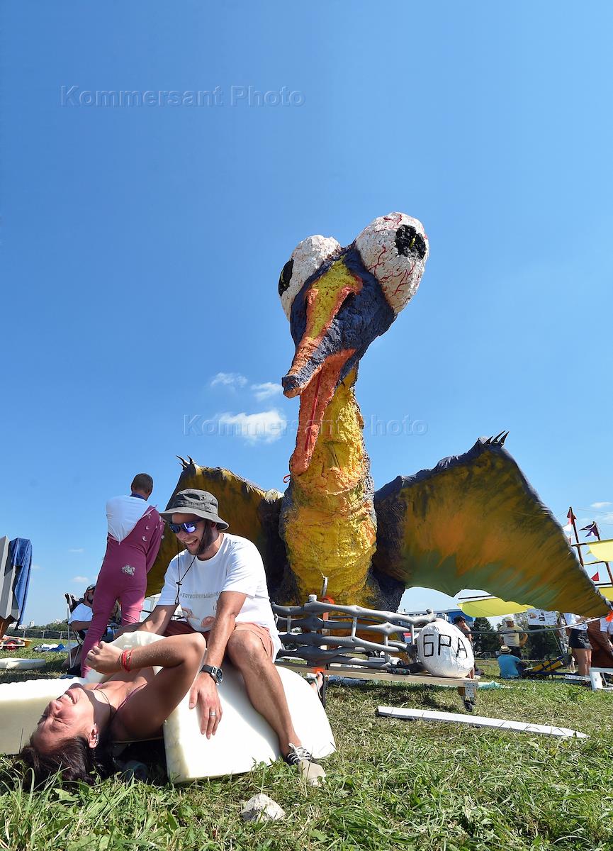 Фестиваль самодельных летательных аппаратов Red Bull Flugtag 2017 прошел на Гребном канале в Крылатском. Участники фестиваля рядом с летательным аппаратом в виде дракона перед началом полетов.