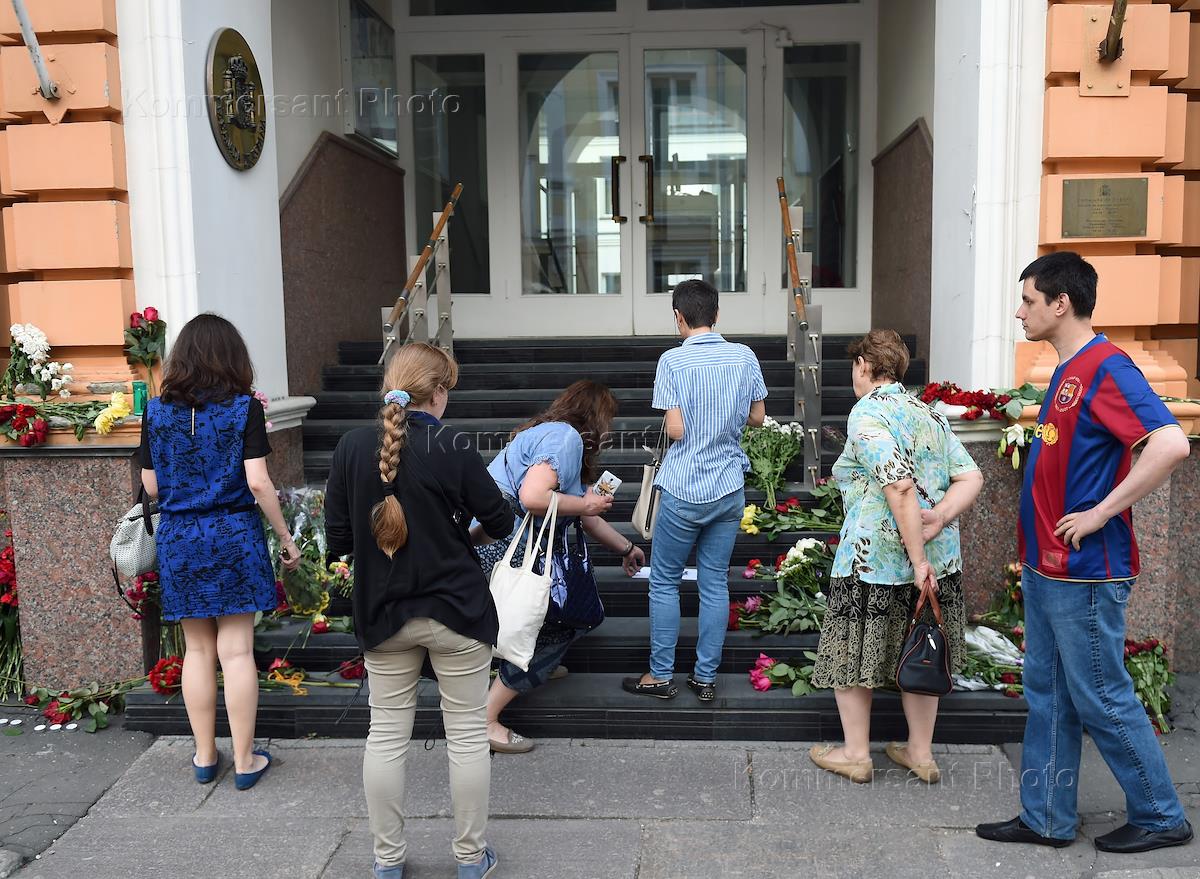 Возложение цветов к зданию посольства Испании в Москве в память о жертвах терактов в городах Каталонии Барселоне и Камбрильсе.