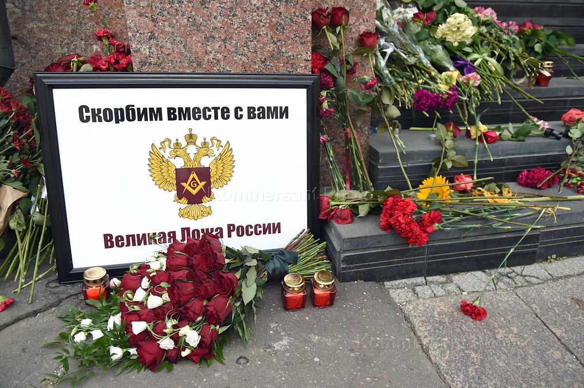 Возложение цветов к зданию посольства Испании в Москве в память о жертвах терактов в городах Каталонии Барселоне и Камбрильсе. Табличка с надписью "Скорбим вместе с вами. Великая Ложа России".