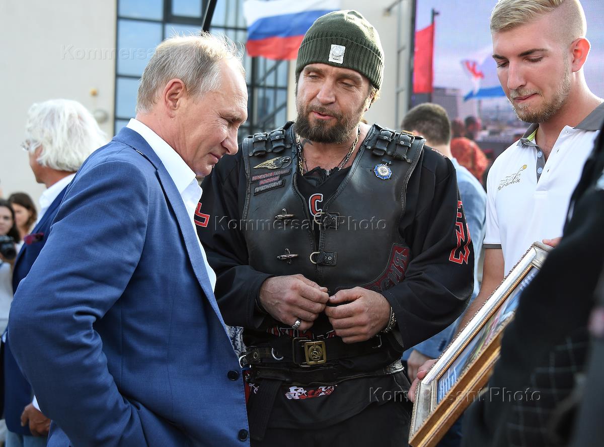 Рабочая поездка президента России Владимира Путина в Крым. Президент России Владимир Путин (слева) и лидер мотоклуба "Ночные волки" Александр "Хирург" Залдостанов (в центре) во время встречи с участниками байк-шоу "Русский реактор" на территории музейного мемориального комплекса "35-я береговая батарея".