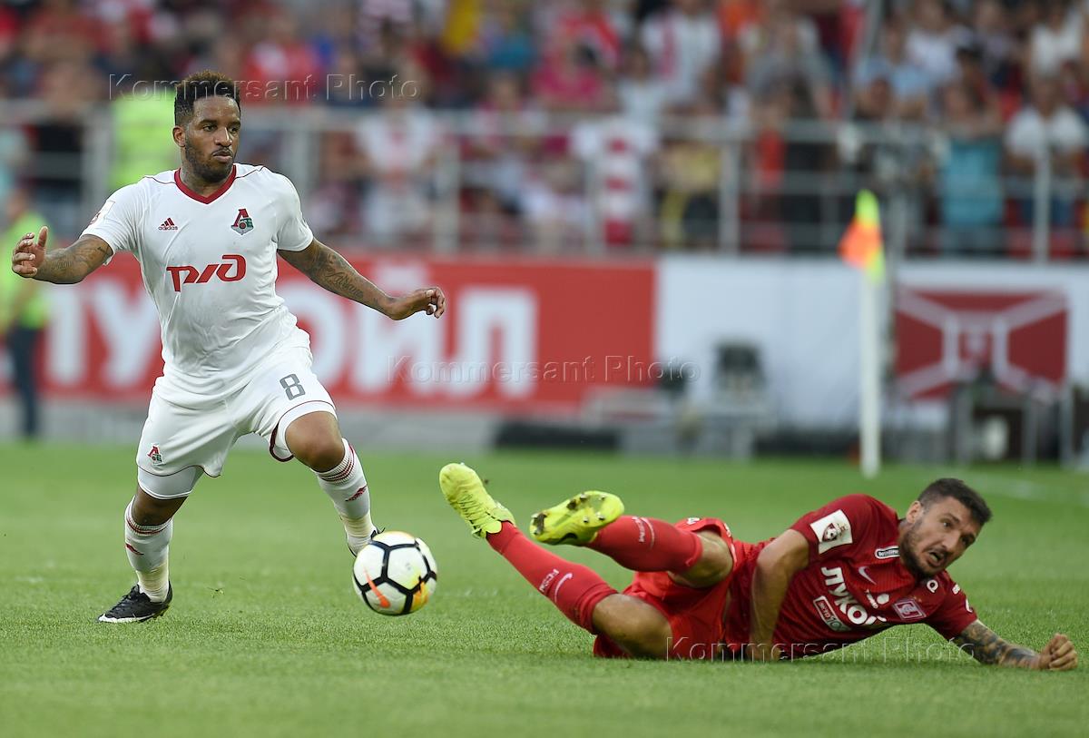 Чемпионат России по футболу 2017/2018, 7-й тур. Матч между командами "Спартак" (Москва) и "Локомотив" (Москва) прошел на стадионе "Открытие Арена". Игрок команды "Локомотив" Джефферсон Фарфан (слева) и игрок команды "Спартак" Сальваторе Боккетти (справа) во время матча.