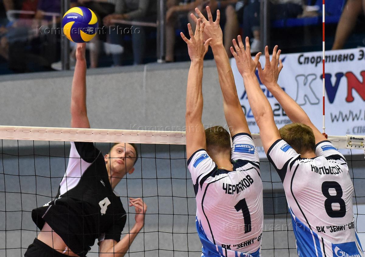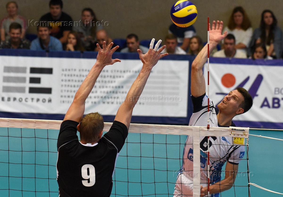 XII международный турнир по волейболу "Мемориал Вячеслава Платонова". Финал. Матч между командами "Зенит" (Санкт-Петербург) и "Белогорье" (Белгород) прошел в академии волейбола имени Платонова. Слева направо: игроки команды "Зенит" Сергей Червяков и Максим Шульгин и игрок команды "Белогорье" Ян Ерещенко во время матча.