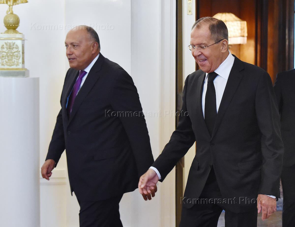 Министра иностранных дел России Сергей Лавров (справа) и министр иностранных дел Арабской Республики Египет Самех Шукри (слева) перед началом встречи в Доме приемов МИД России.