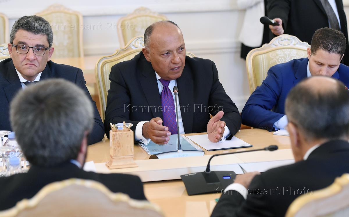 Министра иностранных дел Арабской Республики Египет Самех Шукри (в центре) во время встречи с министром иностранных дел России Сергеем Лавровым в Доме приемов МИД России.