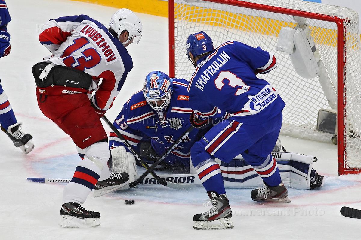 Континентальная хоккейная лига (КХЛ). Кубок Открытия регулярного чемпионата КХЛ. Матч между командами СКА (Санкт-Петербург) и ЦСКА (Москва) прошел в Ледовом дворце. Игроки команды СКА Микко Коскинен (в центре), Динар Хафизуллин (справа) и игрок команды ЦСКА Роман Любимов (справа) во время матча.
