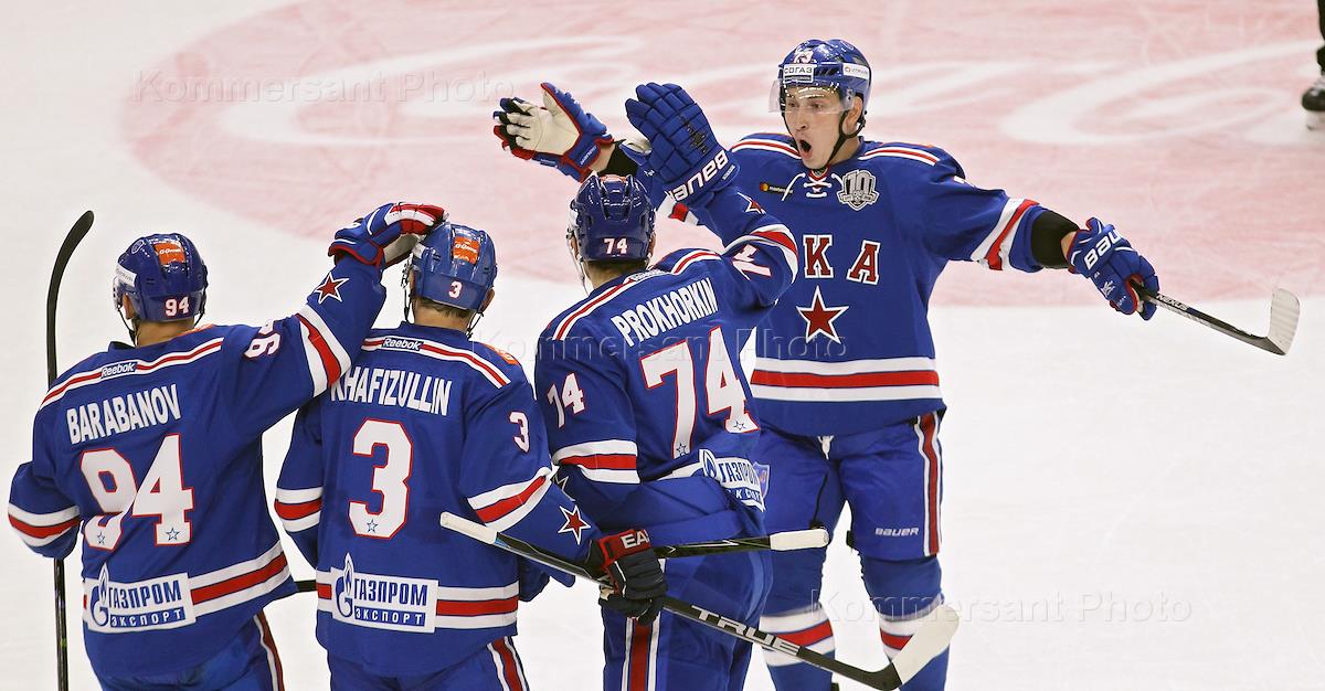 Континентальная хоккейная лига (КХЛ). Кубок Открытия регулярного чемпионата КХЛ. Матч между командами СКА (Санкт-Петербург) и ЦСКА (Москва) прошел в Ледовом дворце. Игроки команды СКА Николай Прохоркин (слева), Динар Хафизуллин (второй слева), Александр Барабанов (справа) и игрок команды ЦСКА Грег Скотт (второй справа) во время матча.