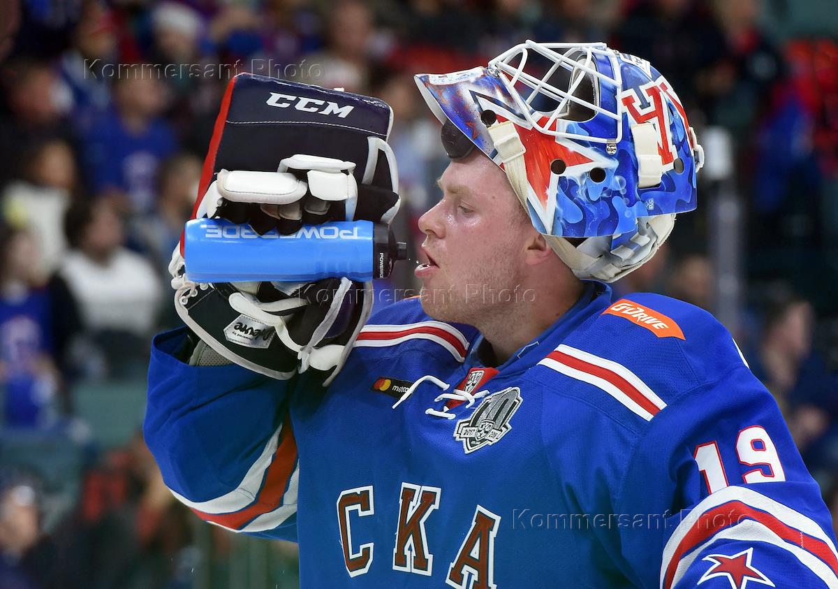 Континентальная хоккейная лига (КХЛ). Кубок Открытия регулярного чемпионата КХЛ. Матч между командами СКА (Санкт-Петербург) и ЦСКА (Москва) прошел в Ледовом дворце. Игрок команды СКА Микко Коскинен во время матча.