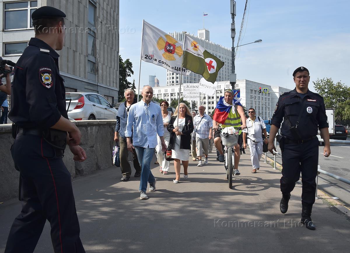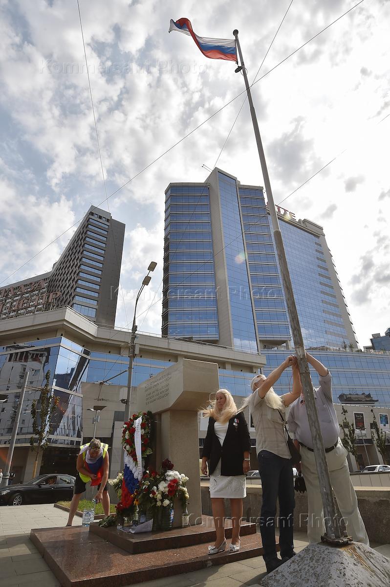 Участники митинга, посвященного годовщине августовских событий 1991 года. Возложение цветов к памятному знаку, в память о погибших участниках защиты Белого дома.