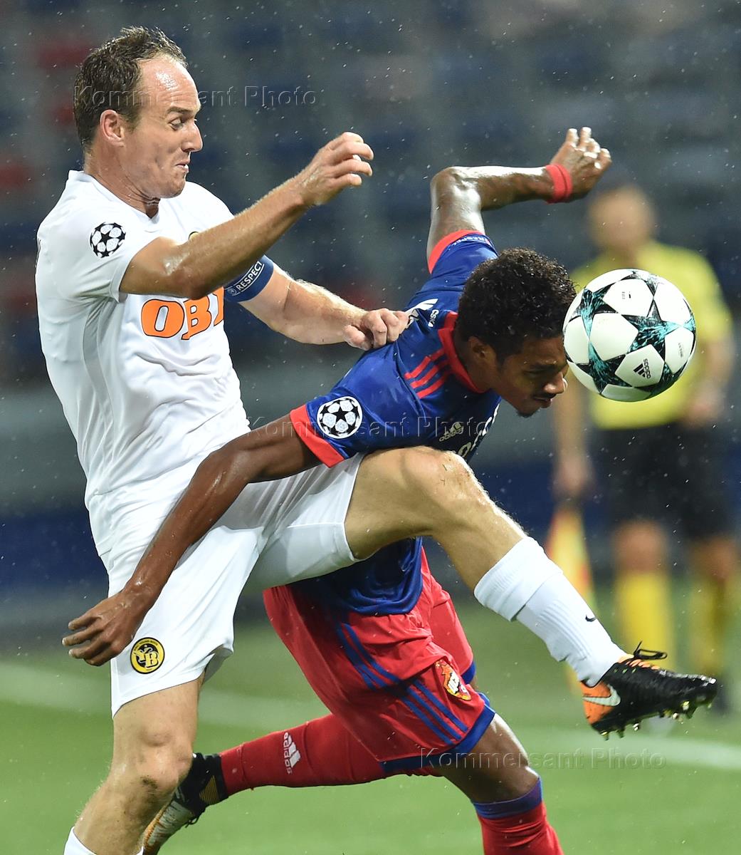 Лига чемпионов УЕФА по футболу. Раунд Плей-офф. Матч между командами "ЦСКА" (Россия) - "Янг Бойз" (Швейцария) на стадионе "ВЭБ Арена". Игрок команды "ЦСКА" Понтус Вермблум (слева) и игрок команды "Янг Бойз" Рожер Ассале (справа) во время матча.