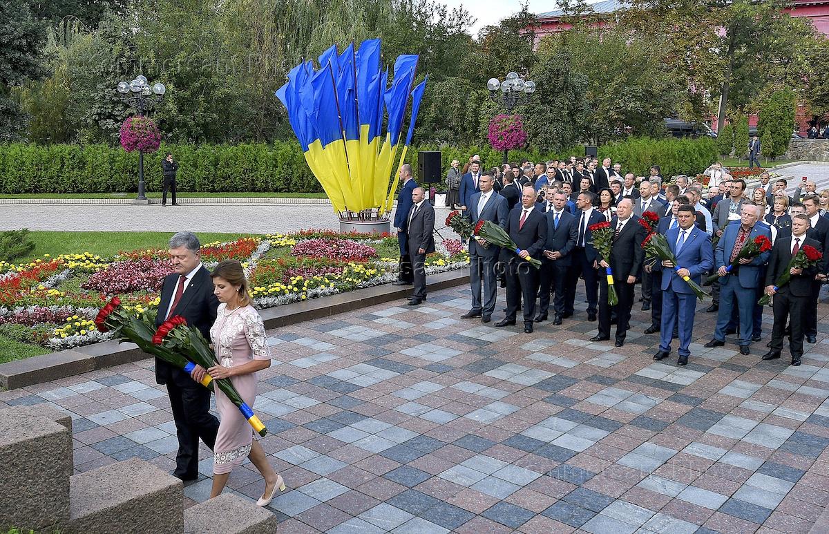 Празднование Дня независимости Украины. Президент Украины Петр Порошенко (справа) с супругой Мариной у мемориала на аллее Героев Небесной сотни.