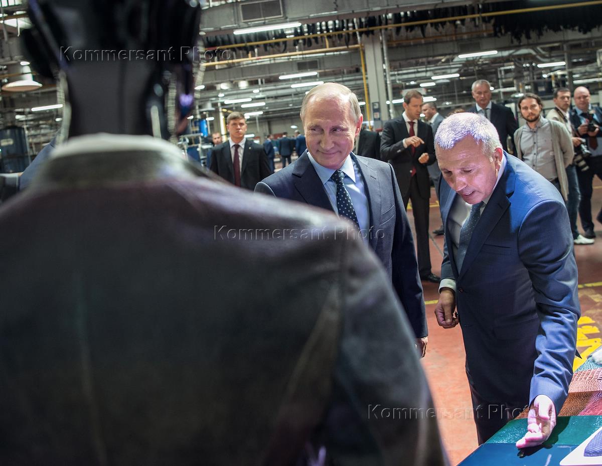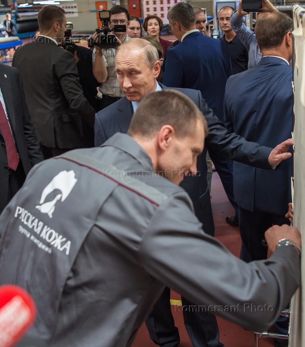 Рабочая поездка президента России Владимира Путина в Рязань. Президент России Владимир Путин во время осмотра выставки предприятий легкой промышленности России на Рязанском кожевенном заводе группы компаний "Русская кожа".
