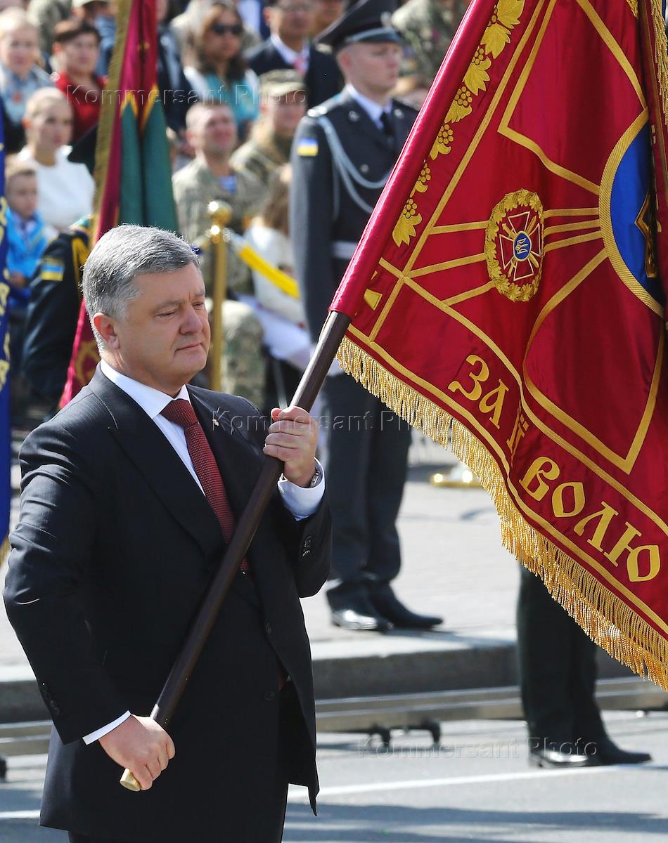 The military parade in honor of Independence Day of Ukraine. Ukrainian president Petro Poroshenko during the military parady at Independence Square.