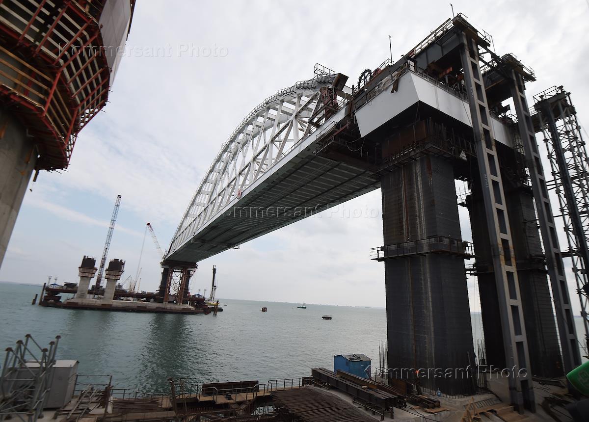 Строительство транспортного перехода через Керченский пролив. Железнодорожная арка во время установки на фарватерные опоры.