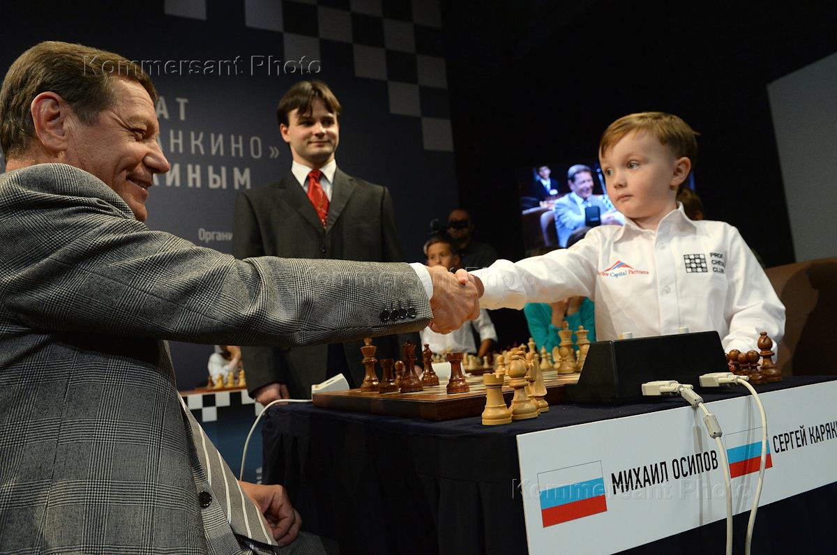 Благотворительный шахматный поединок прошел в телецентре "Останкино". Четырехлетний шахматист Михаил Осипов перед началом шахматного поединка.