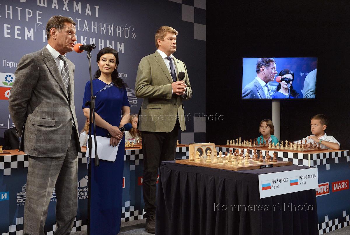 Благотворительный шахматный поединок в телецентре "Останкино". Чемпион мира по быстрым шахматам Сергей Карякин провел сеанс одновременной игры с талантливыми детьми из приемных семей. Историческую партию провел старейший гроссмейстер мира Юрий Авербах и четырехлетний шахматист М.Осипов.