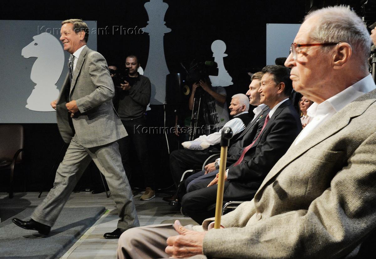 Благотворительный шахматный поединок прошел в телецентре "Останкино". Шахматист Борис Спасский (слева) и чемпион мира по быстрым шахматам и блицу, вице-чемпион мира Сергей Карякин (в центре) во время мероприятия.
