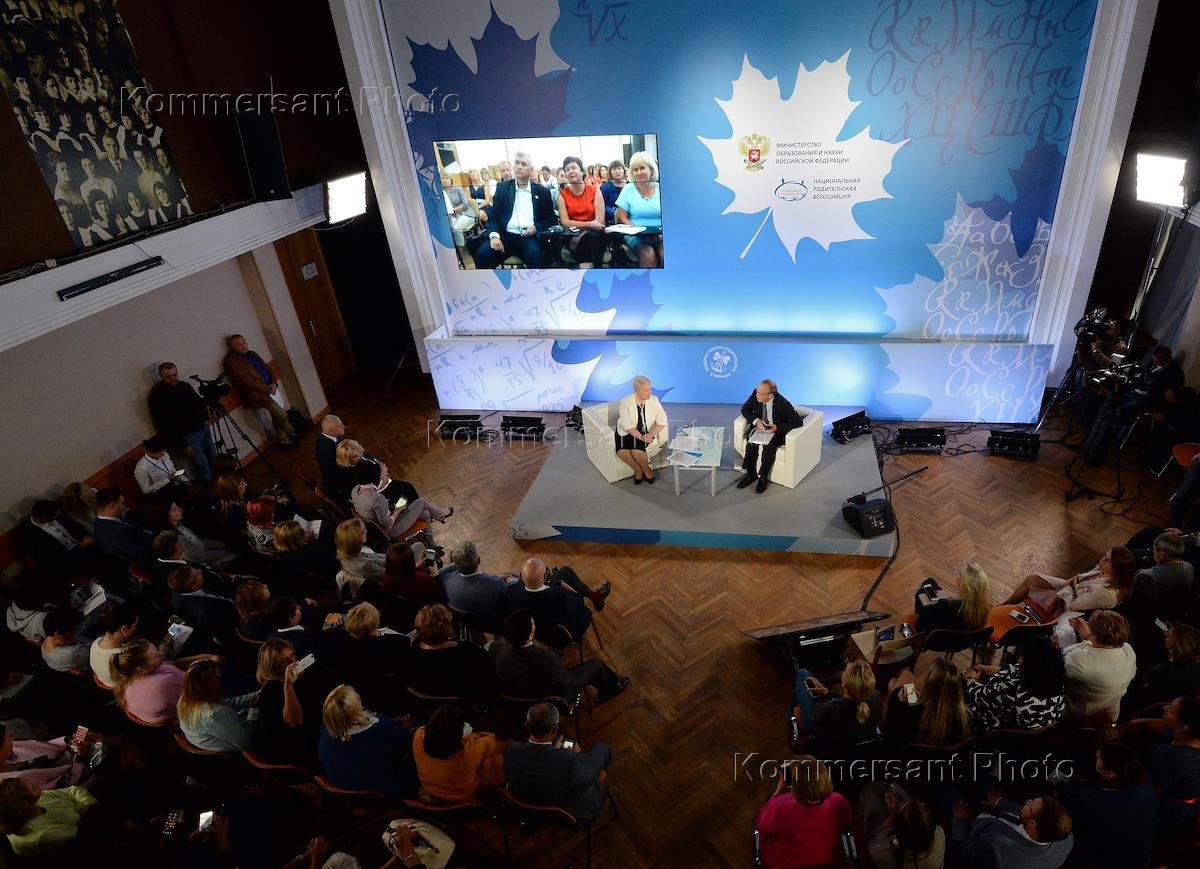 Общероссийское родительское собрание прошло в государственном общеобразовательном учреждение города Москвы "Центр образования № 548 "Царицыно", широко известное как "Школа Рачевского". Министр образования и науки России Ольга Васильева (в центре слева) во время собрания.
