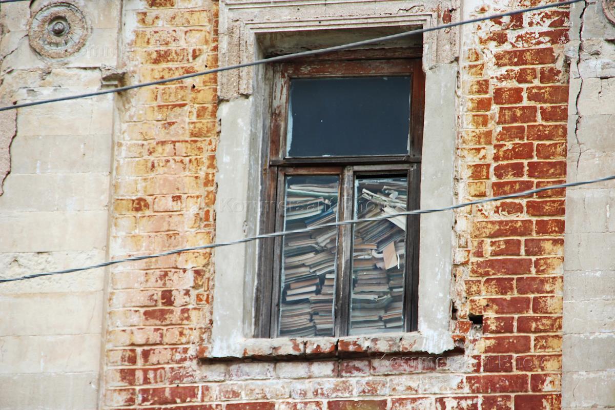 Виды города Лысково. Окно пустующего старинного дома в купеческим стиле, заложенное изнутри книгами.