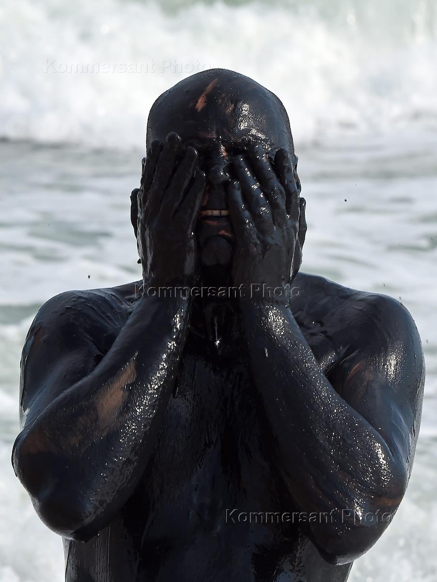 Виды Крыма. Озеро Чокрак. Отдыхающий, намазанный лечебной грязью.
