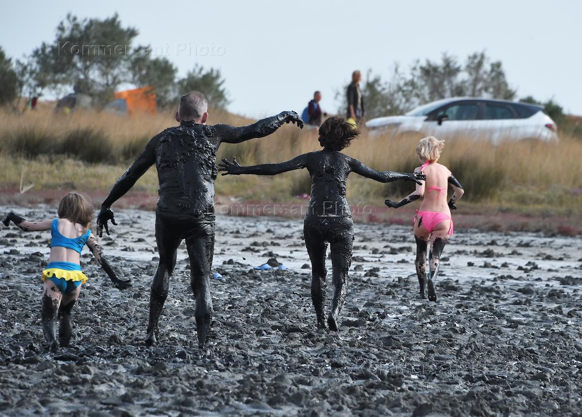 Виды Крыма. Озеро Чокрак. Отдыхающие во время купания в лечебной грязи.