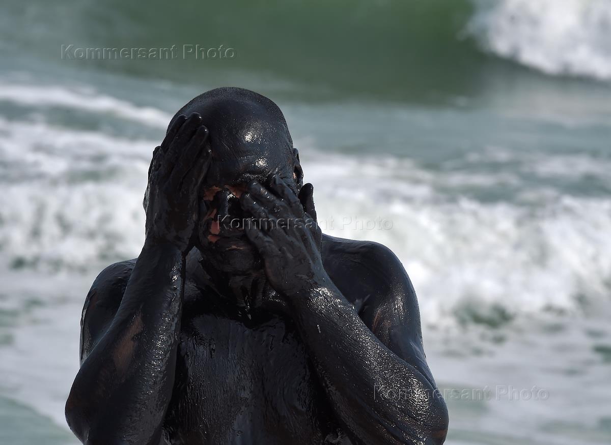 Виды Крыма. Озеро Чокрак. Отдыхающий, намазанный лечебной грязью.