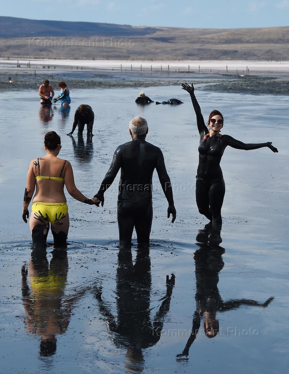 Виды Крыма. Озеро Чокрак. Отдыхающие во время купания в лечебной грязи.
