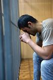 Подозреваемый в подготовке теракта в Москве Муродбек Кодиров (слева) на заседании в Мещанском суде Москвы, где рассматривается ходатайство следствия о его аресте.