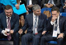 Рабочая поездка президента России Владимира Путина в Ярославскую область. Всероссийский форум профессиональной навигации "ПроеКТОриЯ" прошел в культурно-спортивном комплексе "Арена 2000". Слева направо: президент "Деловой России" Алексей Репик, президент компании "Российские железные дороги" (РЖД) Олег Белозеров и генеральный директор госкорпорации "Росатом" Алексей Лихачев во время всероссийского открытого урока "Россия, устремленная в будущее" в рамках форума.