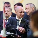 Рабочая поездка президента России Владимира Путина в Ярославскую область. Всероссийский форум профессиональной навигации "ПроеКТОриЯ" прошел в культурно-спортивном комплексе "Арена 2000". Первый заместитель главы администрации президента России Сергей Кириенко (в центре) и полномочный представитель президента в Центральном федеральном округе Александр Беглов (справа) во время форума.