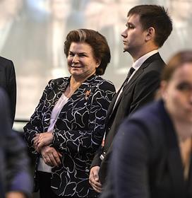 Рабочая поездка президента России Владимира Путина в Ярославскую область. Всероссийский форум профессиональной навигации "ПроеКТОриЯ" прошел в культурно-спортивном комплексе "Арена 2000". Заместитель председателя комитета Государственной думы России по федеративному устройству и вопросам местного самоуправления Валентина Терешкова (слева) во время форума.