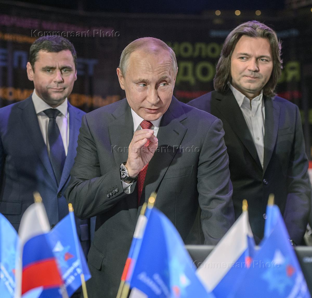 Рабочая поездка президента России Владимира Путина в Ярославскую область. Всероссийский форум профессиональной навигации "ПроеКТОриЯ" прошел в культурно-спортивном комплексе "Арена 2000". Слева направо: временно исполняющий обязанности губернатора Ярославской области Дмитрий Миронов, президент России Владимир Путин и композитор, певец Дмитрий Маликов во время форума.