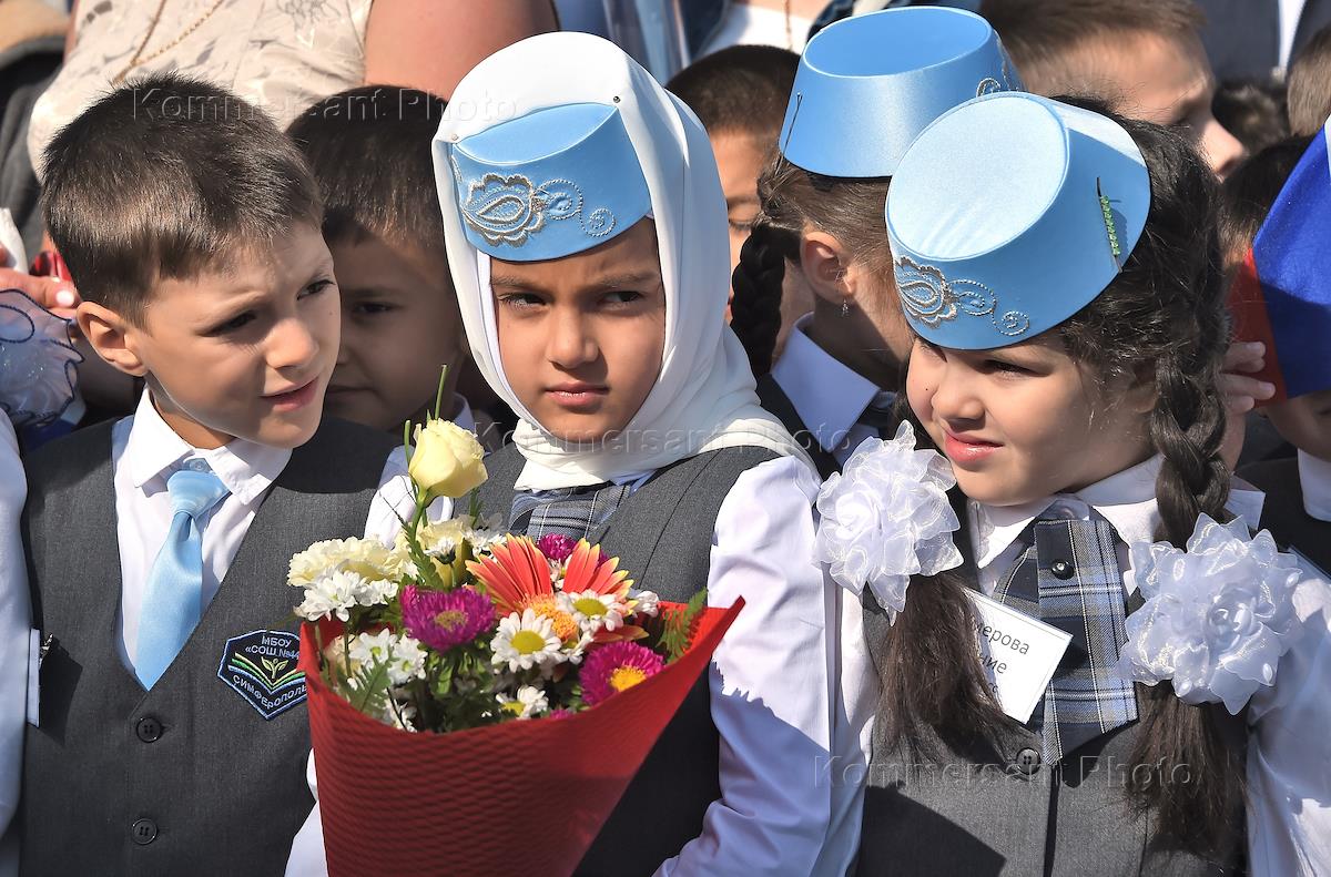 Торжественные мероприятия, посвященные Дню знаний, и открытие новой школы №44 в микрорайоне компактного проживания крымских татар Фонтаны. Первоклассники на уроке.