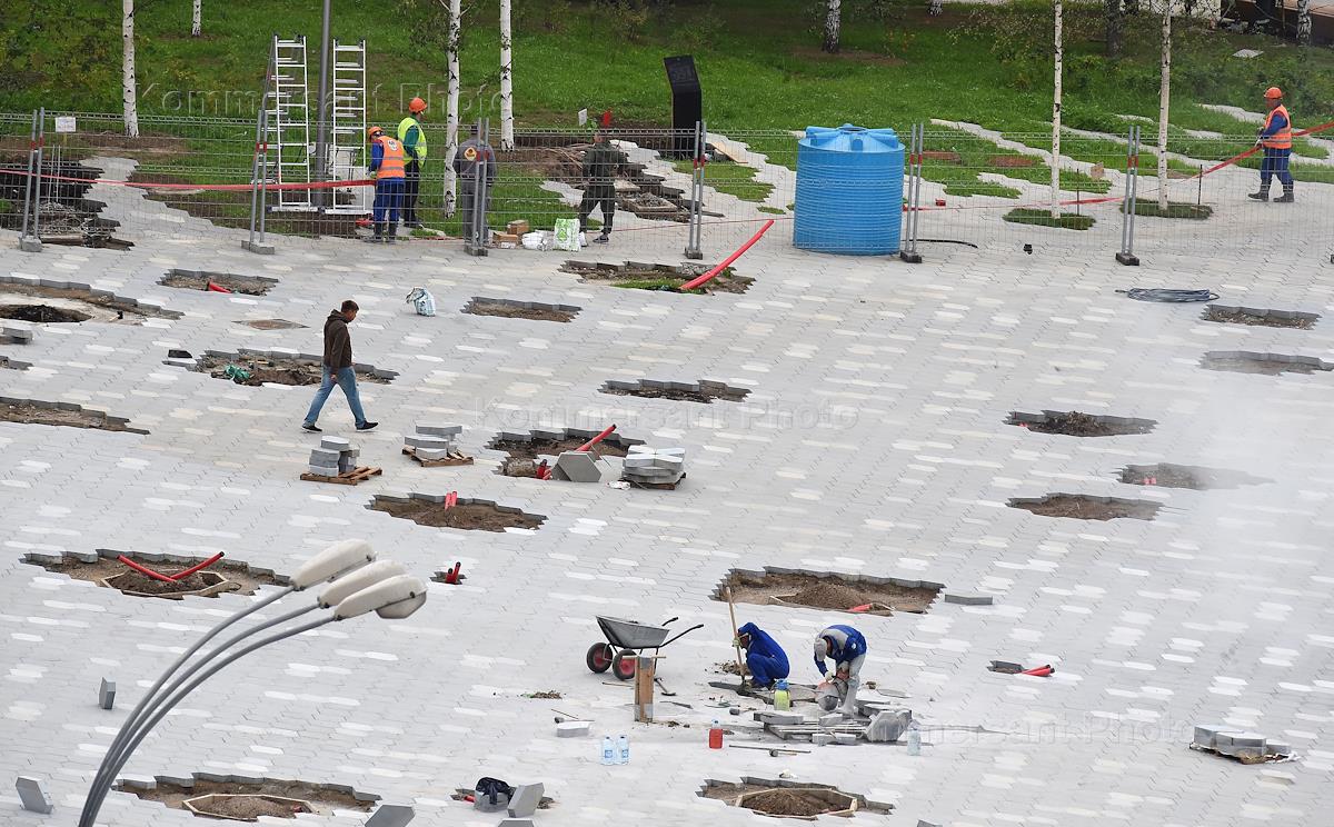 Строительства Парка "Зарядье". Замена тротуарной плитке на Васильевском спуске.