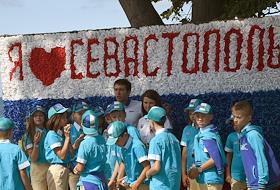 Жанровые фотографии. Дети, отдыхающие в детском центре "Артек" у плаката "Я люблю Севастополь".