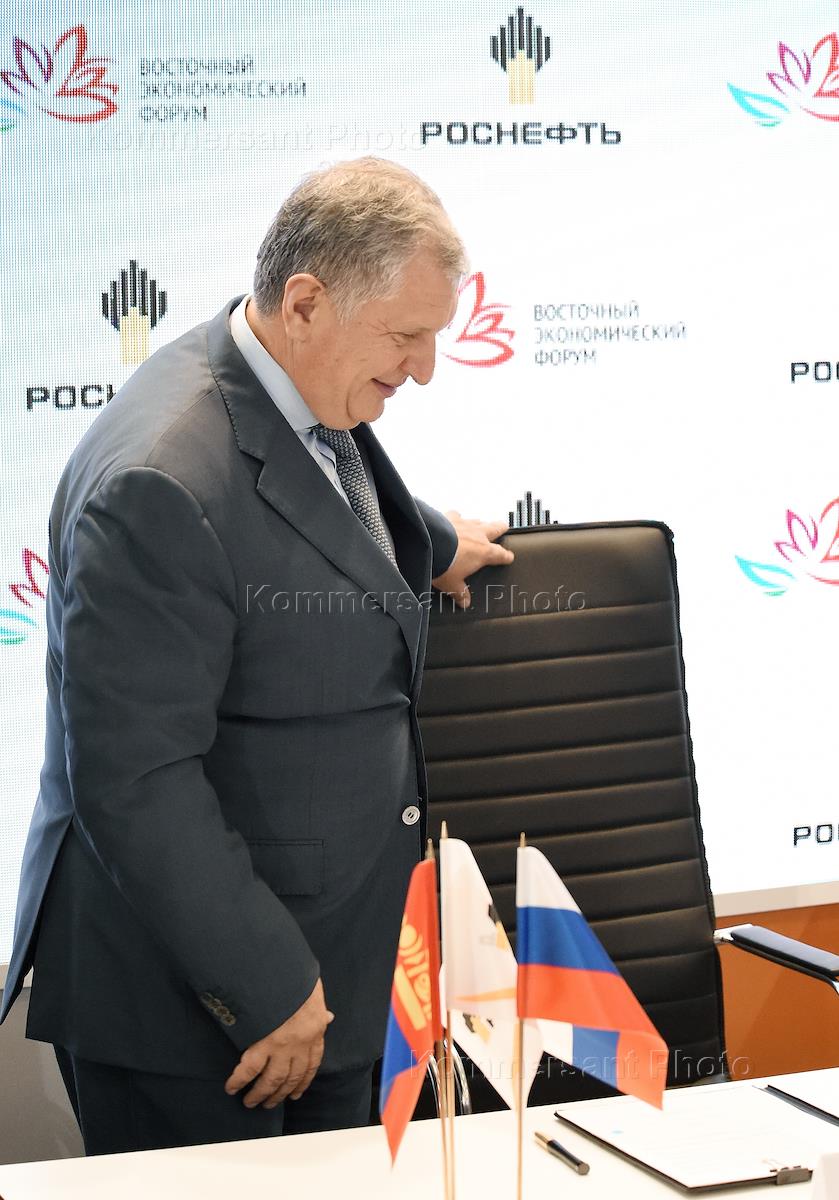 III Восточный экономическоий форум (ВЭФ-2017) на территории Дальневосточного федерального университета (ДВФУ) на острове Русский. Второй день. Главный исполнительный директор, председатель правления, заместитель председателя совета директоров ПАО "НК "Роснефть" Игорь Сечин во время церемонии подписания базовых условий сотрудничества при разработке оптимальных технических решений, вводе в эксплуатацию гидрантной системы и обеспечения авиатопливом нового международного аэропорта "Хушигийн Хундий" в городе Улан-Батор, между ПАО "НК "Роснефть" и министерствм развития дорог и транспорта Монголии.