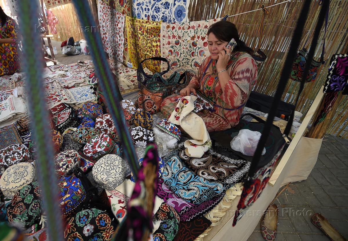 Фестиваль традиционной культуры "O‘zbegim" прошел на улице Сайилгох. Участницца фестиваля во время продажи ковровых изделий.