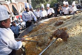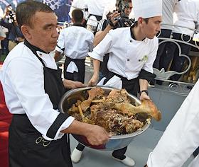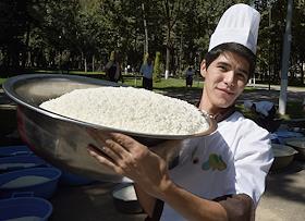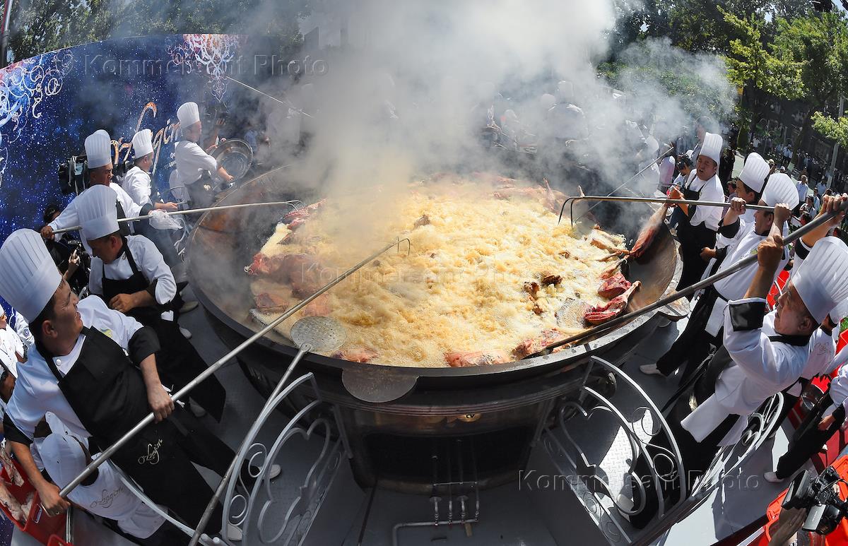 Фестиваль традиционной культуры "O‘zbegim" прошел на улице Сайилгох. Участники гастрономической ярмарки "Тандир шоу" во время приготовления плова. Судья во время судейства для Книги рекордов Гинесса.