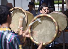 Фестиваль традиционной культуры "O‘zbegim" прошел на улице Сайилгох. Участники фестиваля во время игры на бубнах.