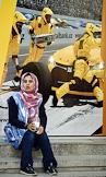 Жанровая фотография. Женщина в платке сидит у плаката с автогонок.