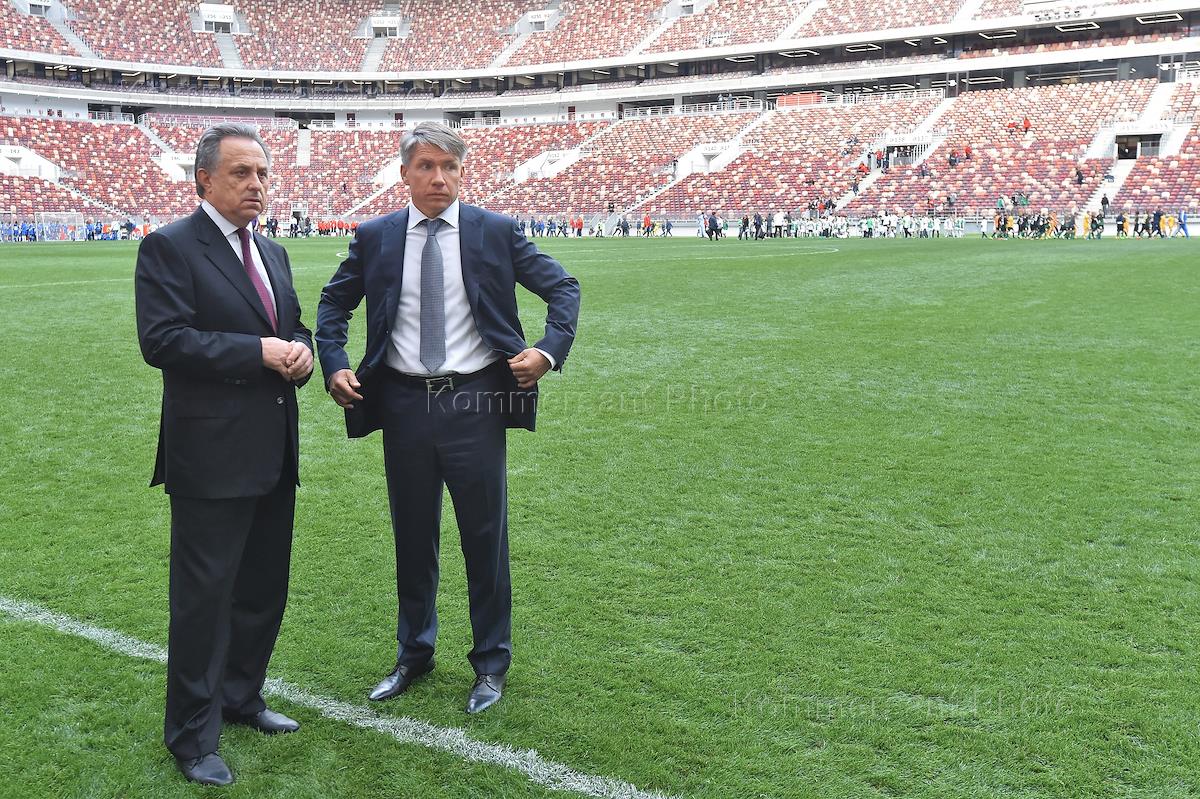 Церемония старта Тура Кубка Чемпионата мира по футболу ФИФА 2018 в России прошла на Большой спортивной арене ОК "Лужники". Заместитель председателя правительства России Виталий Мутко (слева) перед началом церемонии.