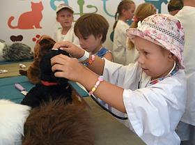 Открытие интерактивного социально-образовательного проекта "Азбука профессий" прошло на площади имени Ленина. Дети во время ознакомления с профессией ветеринара.