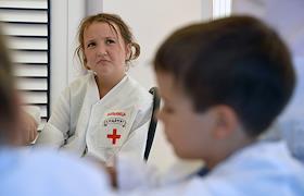 Открытие интерактивного социально-образовательного проекта «Азбука профессий» прошло на площади имени Ленина. Дети во время ознакомления с профессией медика.