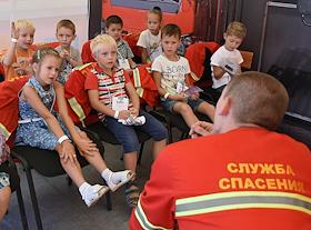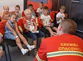 Открытие интерактивного социально-образовательного проекта «Азбука профессий» прошло на площади имени Ленина. Дети во время ознакомления с работой сотрудников МЧС.