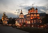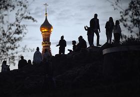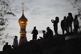 Вид из парка "Зарядье" на церковь великомученика Георгия (она же Покровская) на улице Варварка.