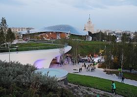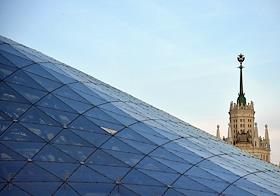 Виды Москвы. Купол Большого амфитеатра в парке "Зарядье" и шпиль высотки на Котельнической набережной.