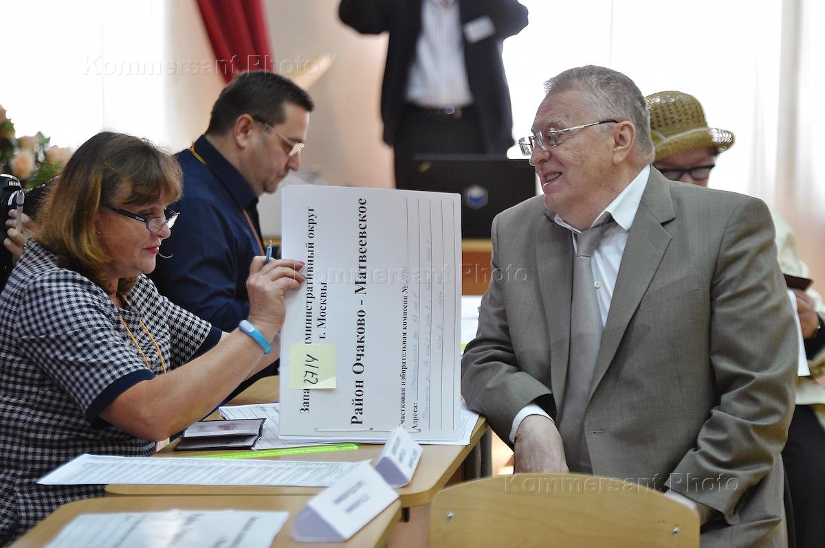 Выборы депутатов представительных органов местного самоуправления 10 сентября 2017 года. Лидер Либерально-демократической партии России (ЛДПР) Владимир Жириновский (в центре) во время голосования на избирательном участке в ГБОУ Школа № 814.