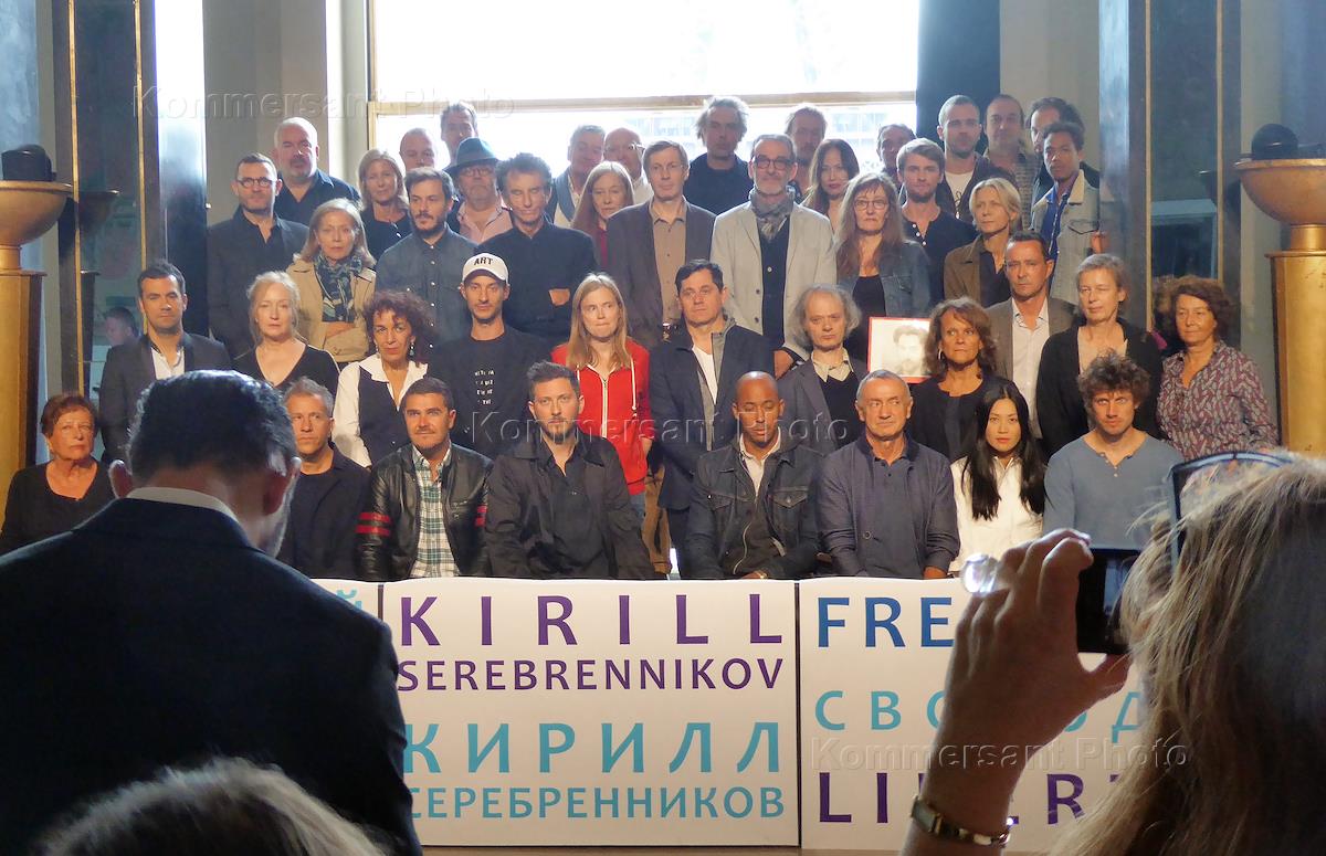 Акция в защиту художественного руководителя "Гоголь-центра" Кирилла Серебренникова прошла в парижском национальном театре Шайо. Деятели французской культуры во время акции.
