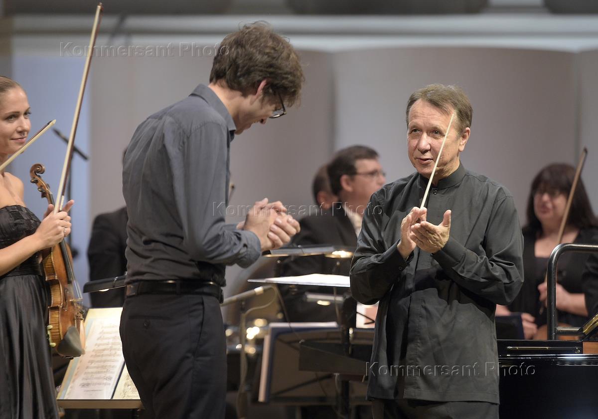 IX Grand Festival of the Russian National Orchestra (RNO) at Tchaikovsky Concert Hall. French pianist Luca Debarg (right) and art director and chief conductor of the Russian National Orchestra Mikhail Pletnev (left) during the opening ceremony.