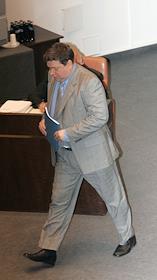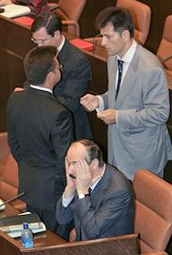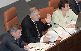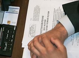 Заседание Совета Федерации России. Сенатор положил руки на документ с надписью "Постановление ...". Карточка для тайного голосования на столе.