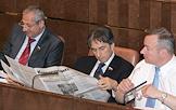 Представитель Госсовета Чечни в Совете Федерации (СФ) России Муса Умаров (слева), представитель Правительства Чечни в СФ Умар Джабраилов (в центре) и представитель администрации Магаданской области в СФ Владимир Кулаков (справа) на очередном заседании Совета Федерации России.